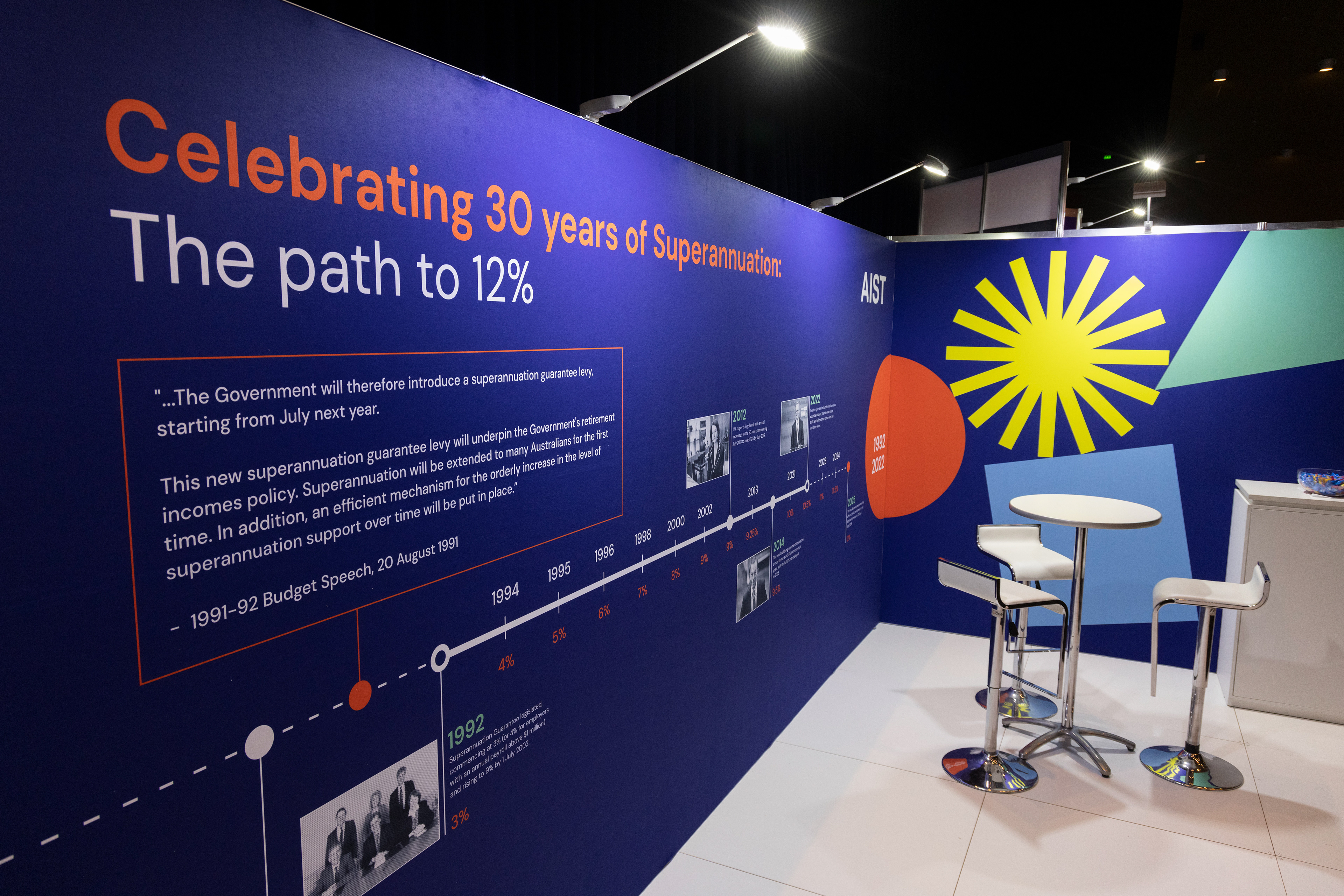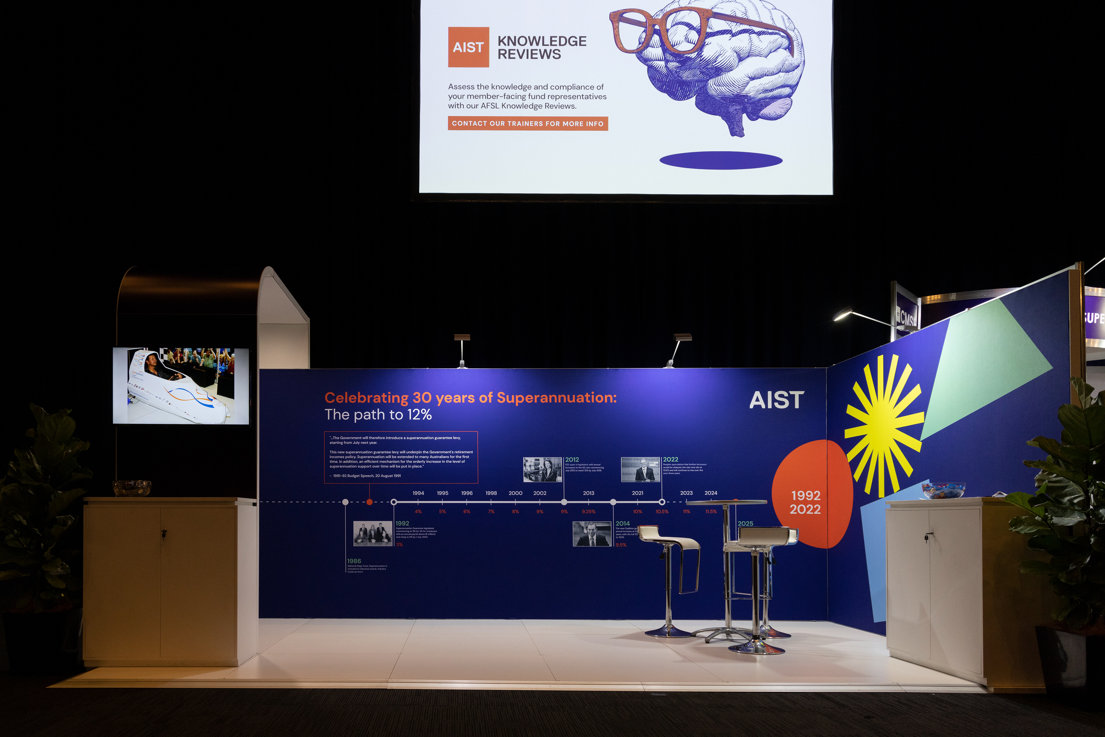 One aspect of the signage and deliverables I was responsible for designing included the AIST booth that to be displayed at CMSF 2022 and CMSF 2023. For this deliverable I worked with Kate Brown, the Senior Manager, Advocacy & Research at AIST to create a timeline graphic that pays homage to the history and future of Superannuation in Australia.